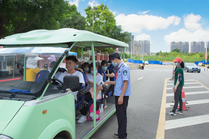 在校门口,新生根据报道流程,扫健康码、消毒、测体温后由学校观光车接送到报到处。报到现场,各班班主任有序地为新生做好报到登记、安排宿舍、饭卡发放等工作,耐心地为新生、家长答疑解惑。