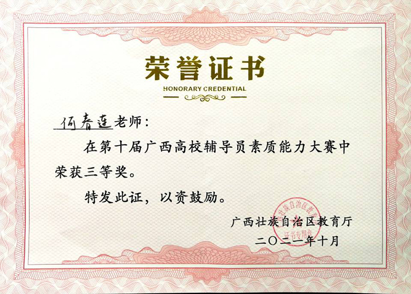 10月20日至22日,由自治区教育厅主办,教育部高校思想政治工作队伍培训研修中心(广西师范大学)承办的第十届广西高校辅导员素质能力大赛在广西师范大学育才校区举办,共有来自全区各高校的81名专职辅导员参赛。经过激烈角逐,问鼎在线(中国)马克思主义学院何春连老师喜获三等奖。