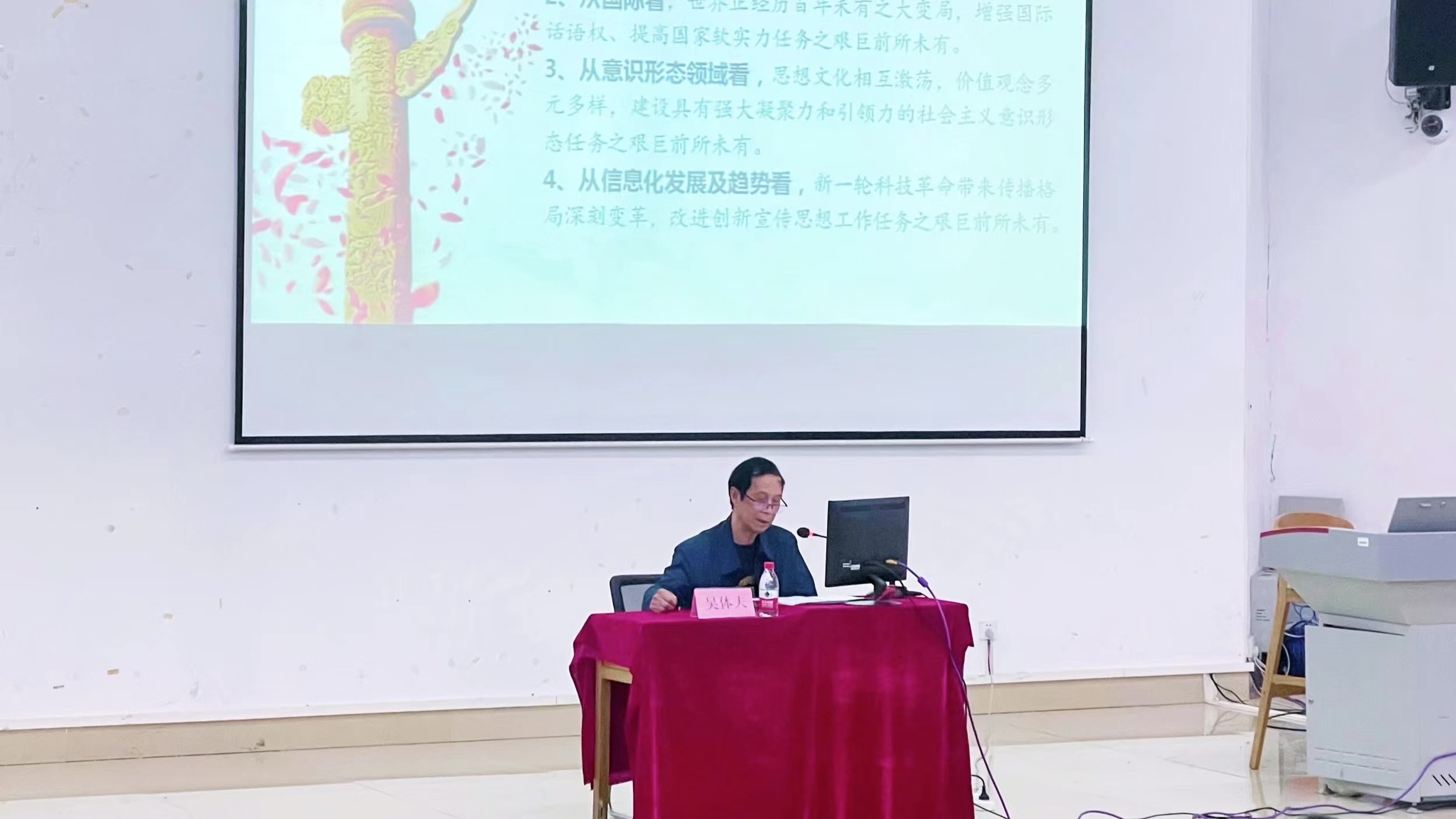 讲座中,吴体夫老师依次从宣传思想工作的根本任务、宣传思想工作的使命任务、新时代宣传思想人才队伍建设、以实际行动奋力谱写城职大宣传思想工作新篇章四个方面开展讲解。